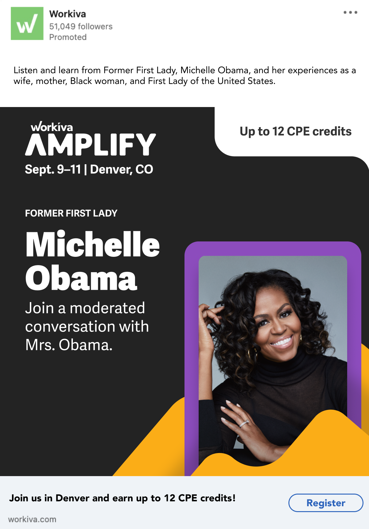 I worked with Workiva to promote Amplify — their annual event that attracts financial professionals from across the globe. My team worked on the campaigns for the 2024 and 2025 conferences. Content was created for AdRoll, LinkedIn, and email campaigns.